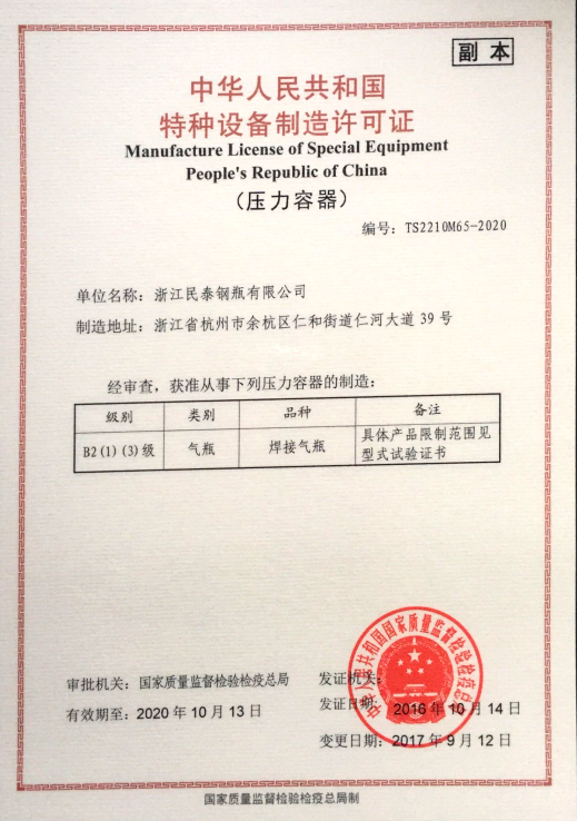 經(jīng)過充分的準(zhǔn)備和嚴(yán)格的測(cè)試,民泰鋼瓶順利地完成了國(guó)家專業(yè)機(jī)構(gòu)評(píng)審,獲得了消防氣瓶的特種設(shè)備生產(chǎn)許可證。民泰鋼瓶穩(wěn)扎穩(wěn)打,不斷提升自身技術(shù)和生產(chǎn)實(shí)力,努力為國(guó)家經(jīng)濟(jì)建設(shè)做出更多貢獻(xiàn)。